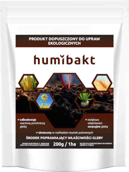 Dawki, terminy i sposób stosowania: HUMIBAKT stosuje się doglebowo lub dolistnie, w formie oprysku w ilości 200 gram produktu na 1 ha powierzchni gleby.
