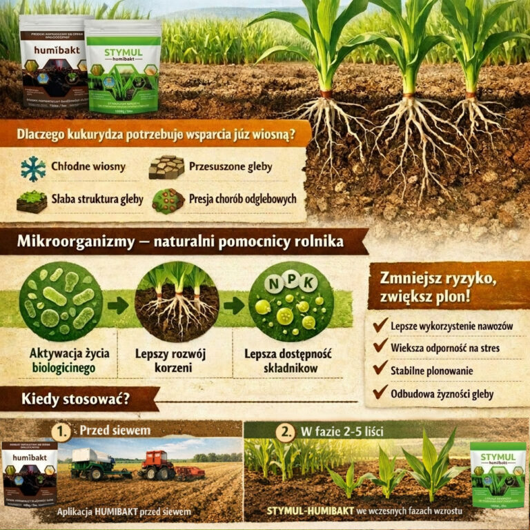 Jednym z takich rozwiązań są preparaty mikrobiologiczne zawierające pożyteczne bakterie oraz substancje humusowe, takie jak HUMIBAKT i STYMUL-HUMIBAKT. To produkty, które działają bezpośrednio w glebie – tam, gdzie zaczyna się zdrowie i siła kukurydzy.